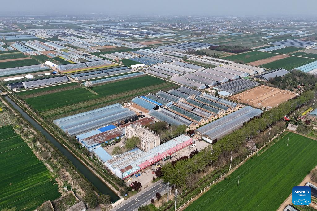 An aerial drone photo taken on April 9, 2026 shows a vegetable farm with agricultural technology support in Jingyang County, northwest China's Shaanxi Province.