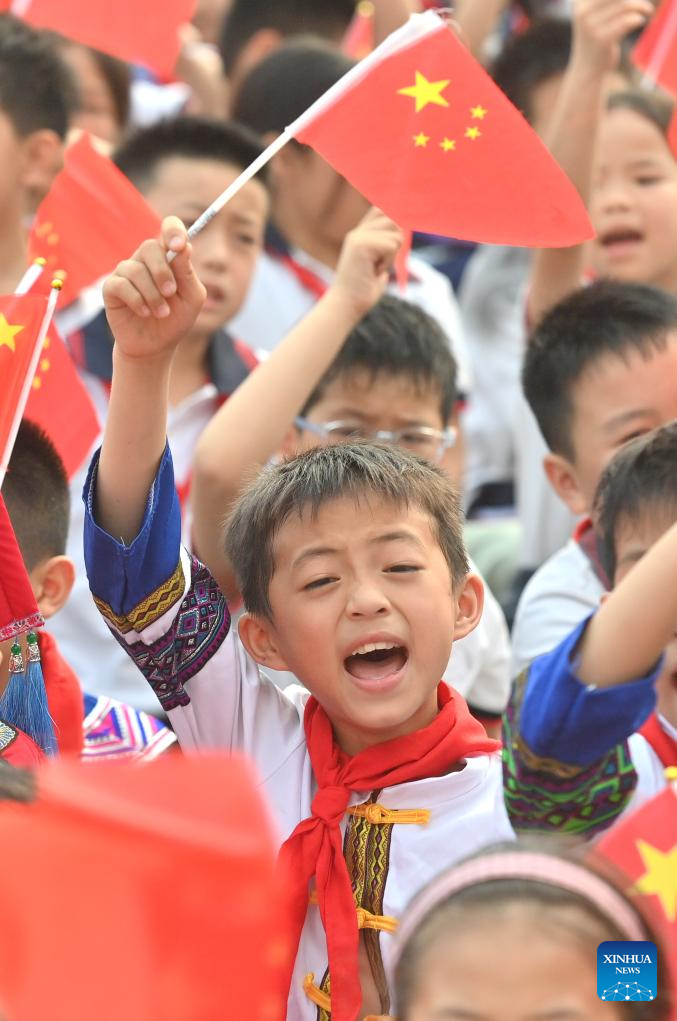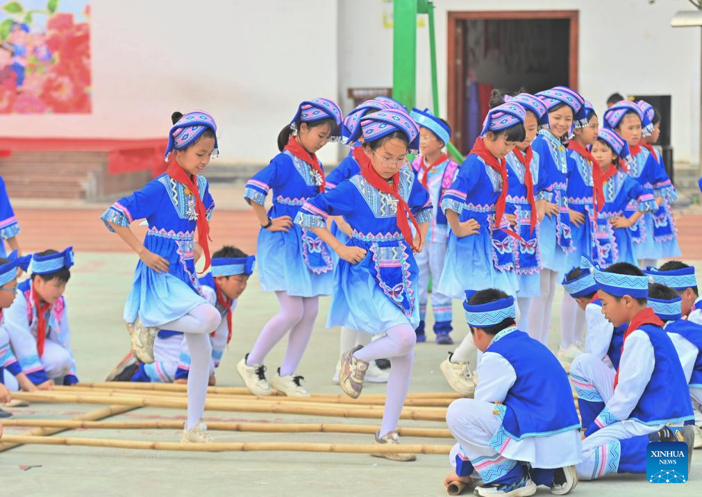 Students dance at a primary school in Changzhou District of Wuzhou City, south China's Guangxi Zhuang Autonomous Region, April 15, 2026. The Sanyuesan Festival is a traditional festival celebrated on the third day of the third lunar month by various ethnic groups in China, which falls on April 19 this year. (Xinhua/Huang Xiaobang)