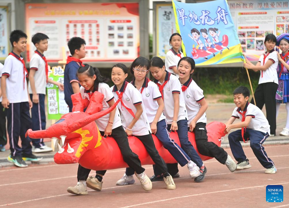 Students take part in an on-land dragon boat race at a primary school in Changzhou District of Wuzhou City, south China's Guangxi Zhuang Autonomous Region, April 15, 2026. The Sanyuesan Festival is a traditional festival celebrated on the third day of the third lunar month by various ethnic groups in China, which falls on April 19 this year. (Xinhua/Huang Xiaobang)