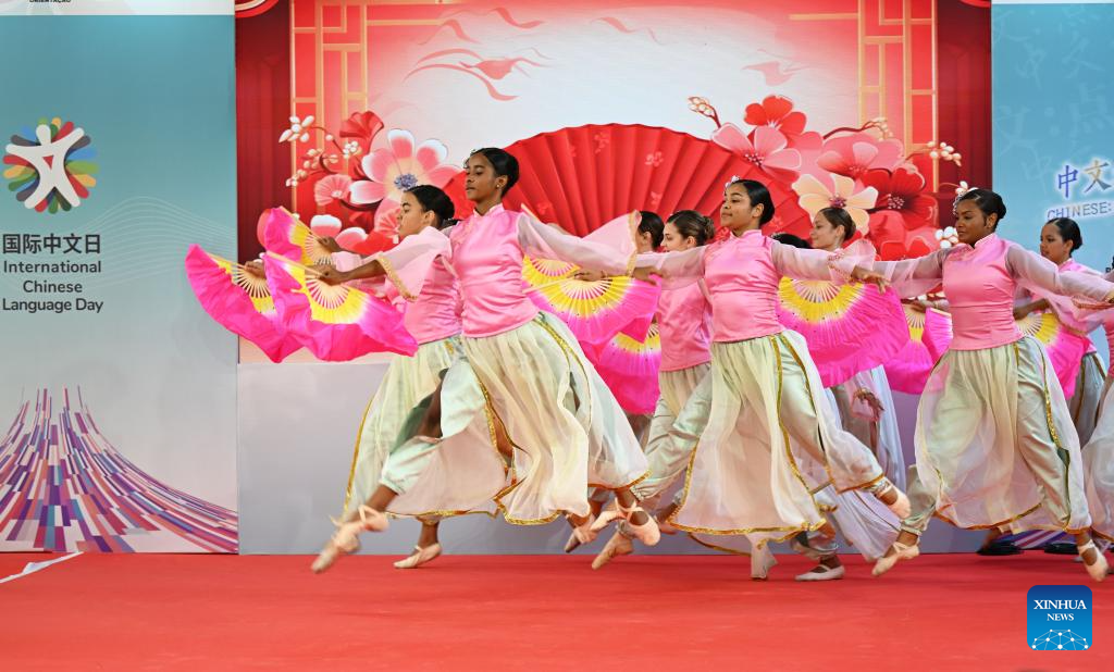 Brazilian women perform Chinese dance during a celebration event marking the International Chinese Language Day in Rio de Janeiro, Brazil, April 15, 2026. Themed "Chinese: Sparking Colorful Dreams," the celebration event marking the International Chinese Language Day was held at the Pontifical Catholic University of Rio de Janeiro in Brazil on Wednesday, attracting a large number of spectators to experience the charm of Chinese language. (Xinhua/Jin Haoyuan)