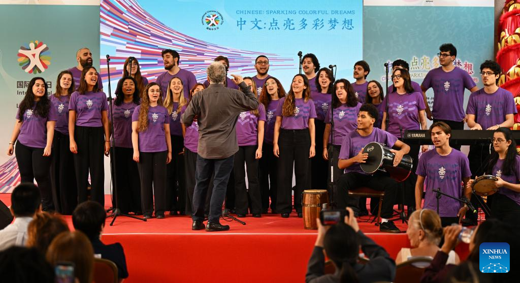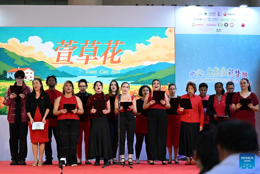 Brazilian performers sing a Chinese song during a celebration event marking the International Chinese Language Day in Rio de Janeiro, Brazil, April 15, 2026. Themed "Chinese: Sparking Colorful Dreams," the celebration event marking the International Chinese Language Day was held at the Pontifical Catholic University of Rio de Janeiro in Brazil on Wednesday, attracting a large number of spectators to experience the charm of Chinese language. (Xinhua/Jin Haoyuan)