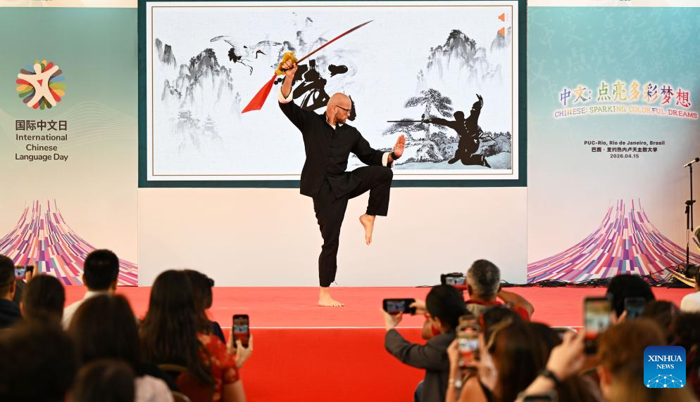 A Brazilian man performs Chinese martial arts during a celebration event marking the International Chinese Language Day in Rio de Janeiro, Brazil, April 15, 2026. Themed "Chinese: Sparking Colorful Dreams," the celebration event marking the International Chinese Language Day was held at the Pontifical Catholic University of Rio de Janeiro in Brazil on Wednesday, attracting a large number of spectators to experience the charm of Chinese language. (Xinhua/Jin Haoyuan)