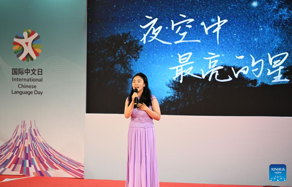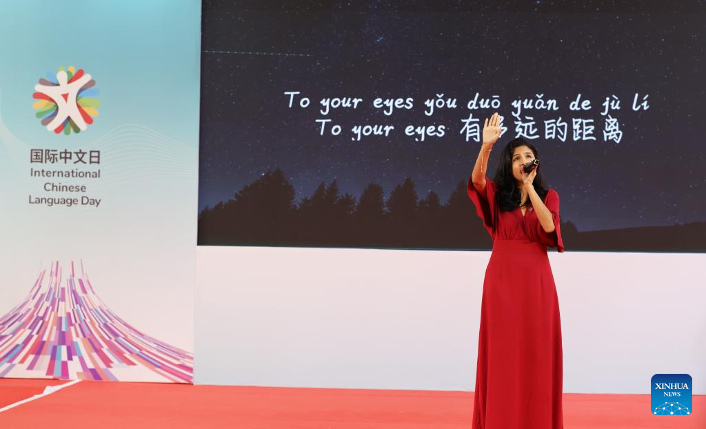 A performer sings a Chinese song during a celebration event marking the International Chinese Language Day in Rio de Janeiro, Brazil, April 15, 2026. Themed "Chinese: Sparking Colorful Dreams," the celebration event marking the International Chinese Language Day was held at the Pontifical Catholic University of Rio de Janeiro in Brazil on Wednesday, attracting a large number of spectators to experience the charm of Chinese language. (Xinhua/Jin Haoyuan)