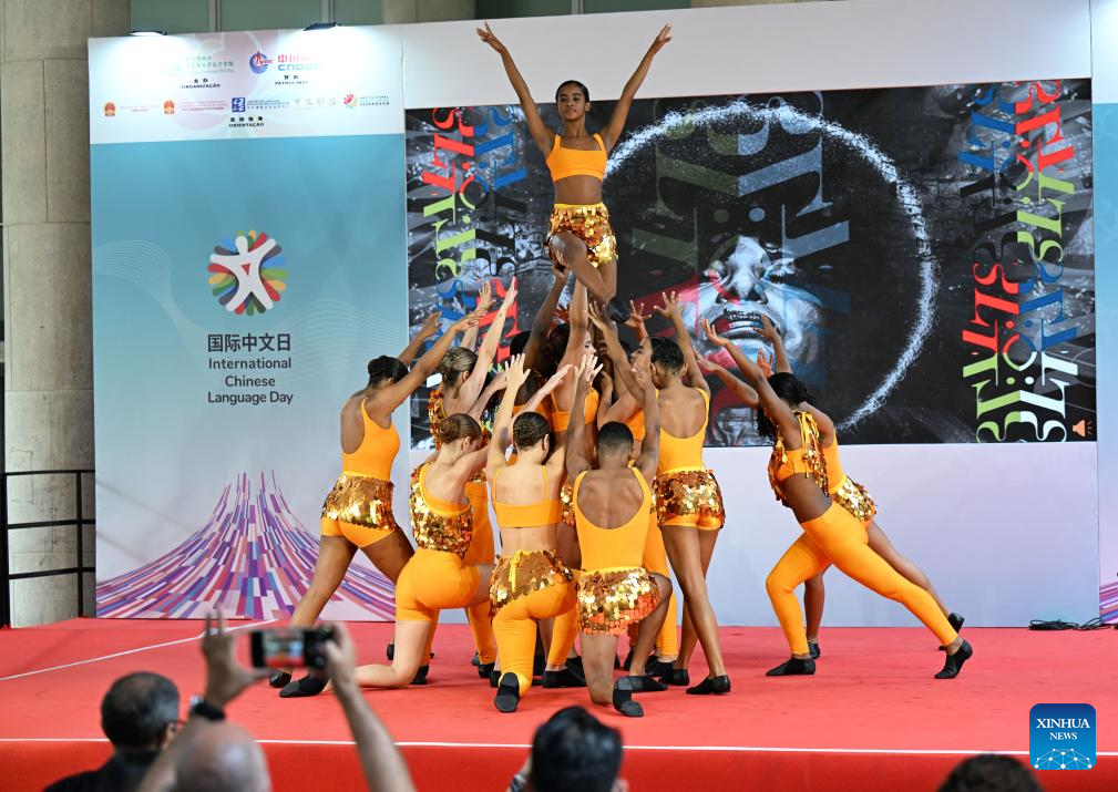 Brazilian performers dance during a celebration event marking the International Chinese Language Day in Rio de Janeiro, Brazil, April 15, 2026. Themed "Chinese: Sparking Colorful Dreams," the celebration event marking the International Chinese Language Day was held at the Pontifical Catholic University of Rio de Janeiro in Brazil on Wednesday, attracting a large number of spectators to experience the charm of Chinese language. (Xinhua/Jin Haoyuan)