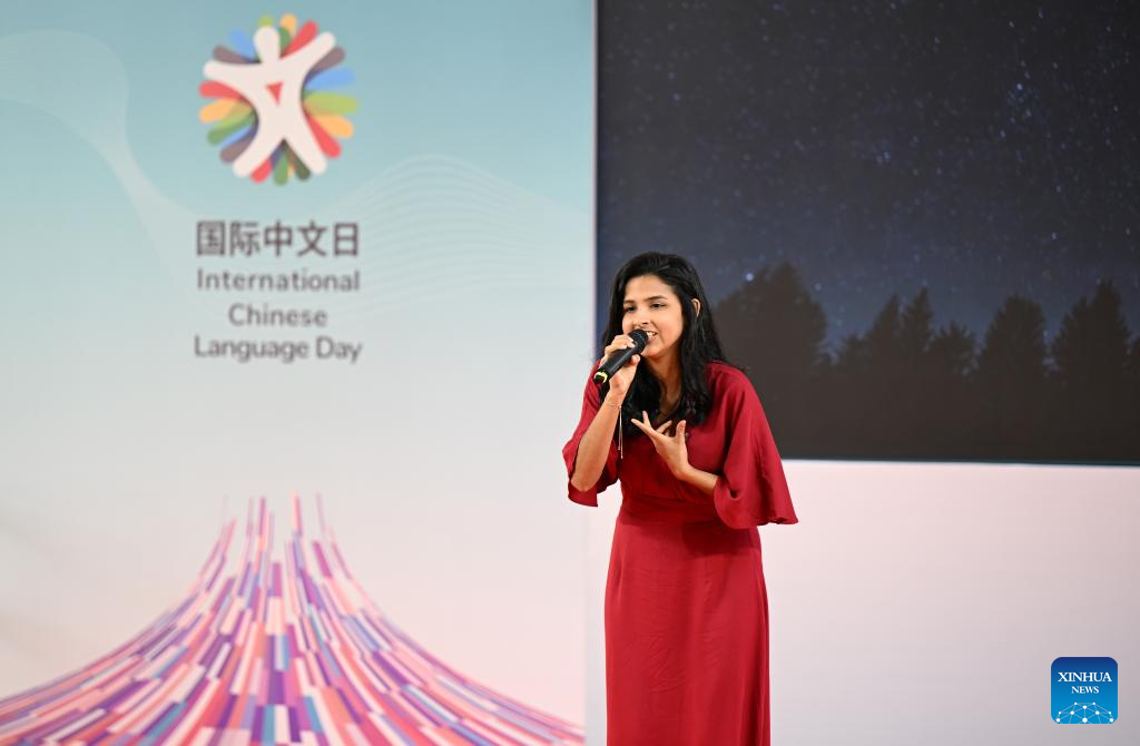 A Brazilian woman sings a Chinese song during a celebration event marking the International Chinese Language Day in Rio de Janeiro, Brazil, April 15, 2026. Themed "Chinese: Sparking Colorful Dreams," the celebration event marking the International Chinese Language Day was held at the Pontifical Catholic University of Rio de Janeiro in Brazil on Wednesday, attracting a large number of spectators to experience the charm of Chinese language. (Xinhua/Jin Haoyuan)