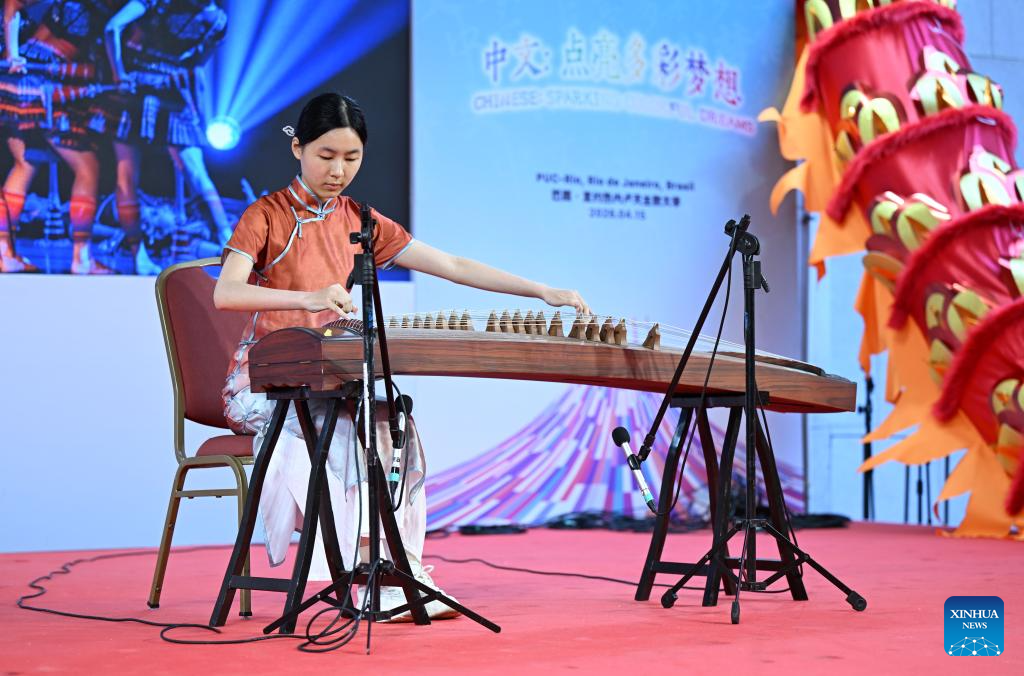 A performer plays Guzheng, a traditional Chinese musical instrument, during a celebration event marking the International Chinese Language Day in Rio de Janeiro, Brazil, April 15, 2026. Themed "Chinese: Sparking Colorful Dreams," the celebration event marking the International Chinese Language Day was held at the Pontifical Catholic University of Rio de Janeiro in Brazil on Wednesday, attracting a large number of spectators to experience the charm of Chinese language. (Xinhua/Jin Haoyuan)