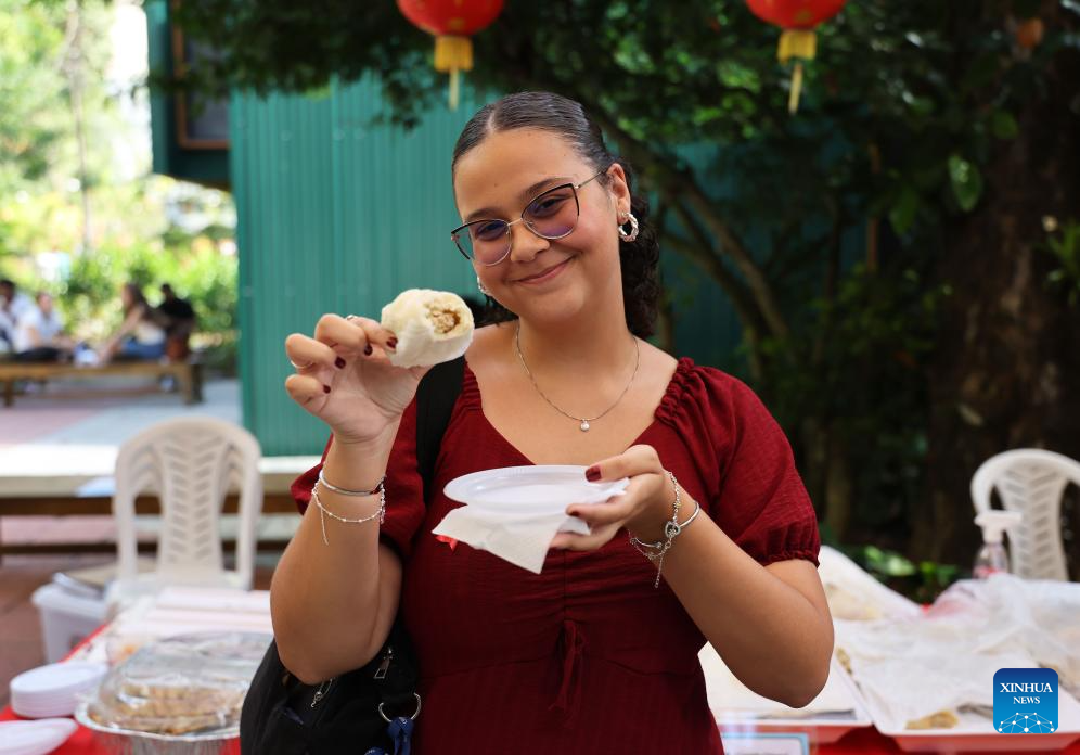 A Brazilian student tastes Chinese food during a celebration event marking the International Chinese Language Day in Rio de Janeiro, Brazil, April 15, 2026. Themed "Chinese: Sparking Colorful Dreams," the celebration event marking the International Chinese Language Day was held at the Pontifical Catholic University of Rio de Janeiro in Brazil on Wednesday, attracting a large number of spectators to experience the charm of Chinese language. (Xinhua/Jin Haoyuan)