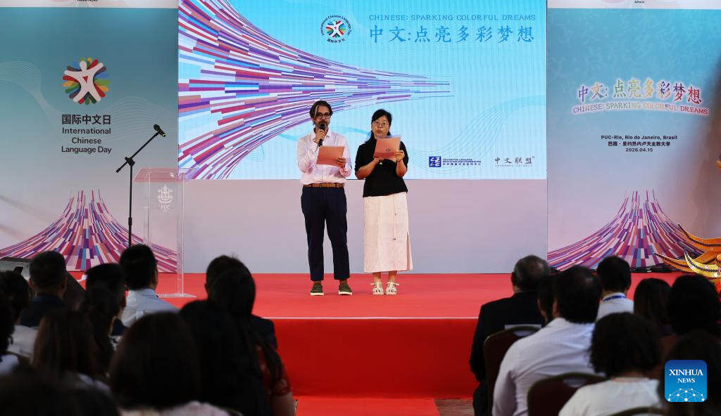 Photo taken on April 15, 2026 shows a celebration event marking the International Chinese Language Day in Rio de Janeiro, Brazil. Themed "Chinese: Sparking Colorful Dreams," the celebration event marking the International Chinese Language Day was held at the Pontifical Catholic University of Rio de Janeiro in Brazil on Wednesday, attracting a large number of spectators to experience the charm of Chinese language. (Xinhua/Jin Haoyuan)
