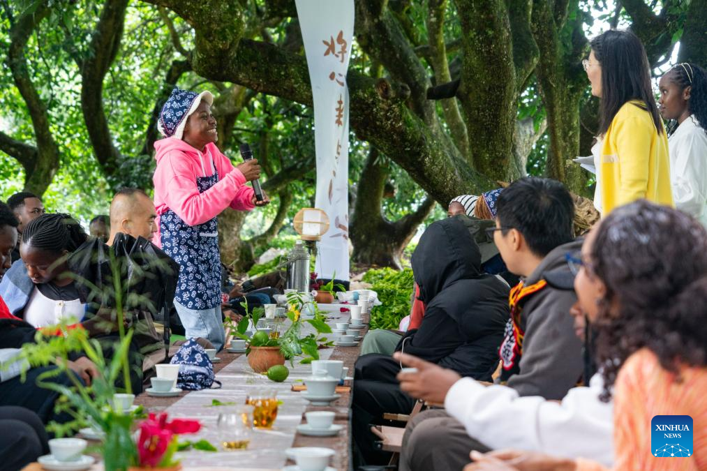 A teacher from the Confucius Institute at the University of Nairobi introduces tea art for students at a tea garden in Kiambu County, Kenya, April 15, 2026.