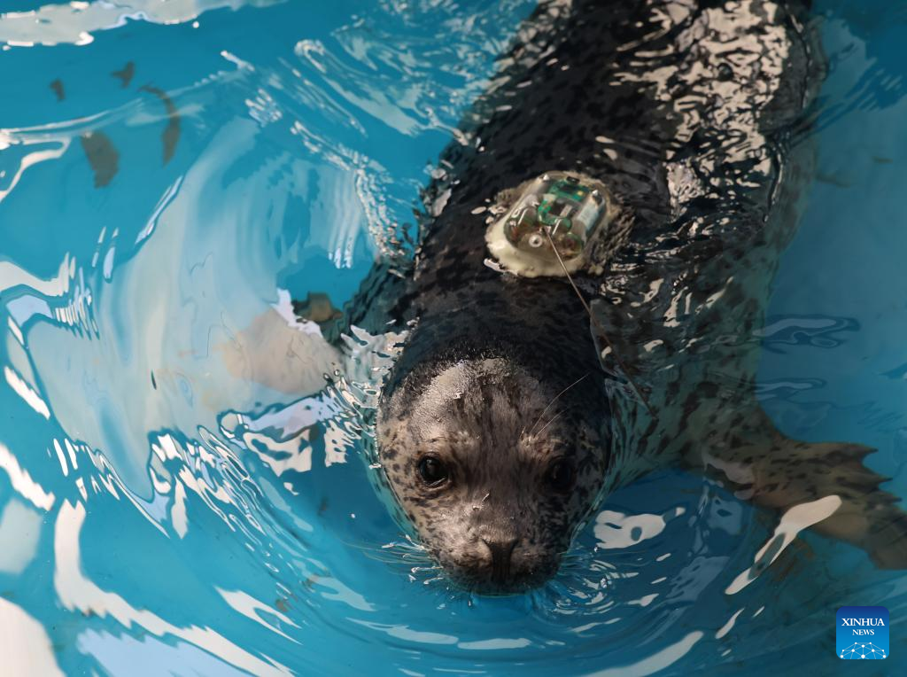 A spotted seal, wearing a monitoring and tracking tag on its back, swims in a pool before being released at the Liaoning Ocean and Fisheries Science Research Institute in Dalian, northeast China's Liaoning Province, April 15, 2026. Five spotted seals were released into waters off the coast of Dalian on Thursday. Three of them were rescued and rehabilitated by the Liaoning Ocean and Fisheries Science Research Institute, while the other two were artificially bred by Sunasia Ocean World in Dalian.