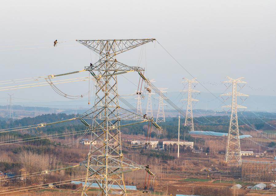 A drone photo taken on Dec. 16, 2025 shows constructors working on a power transmission line in east China's Anhui Province. (Photo by Zheng Xianlie/Xinhua)
