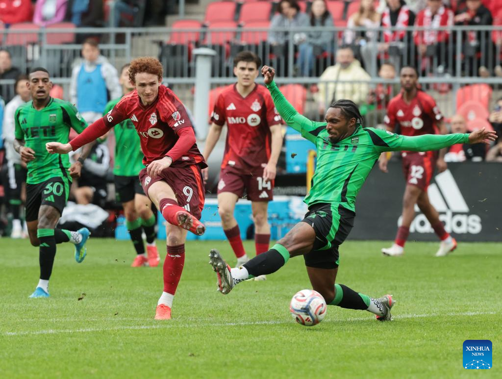 Josh Sargent (L, front) of Toronto FC shoots during the 2026 Major League Soccer (MLS) regular season match between Toronto FC and Austin FC at BMO Field in Toronto, Canada, April 18, 2026. (Photo by Zou Zheng/Xinhua)