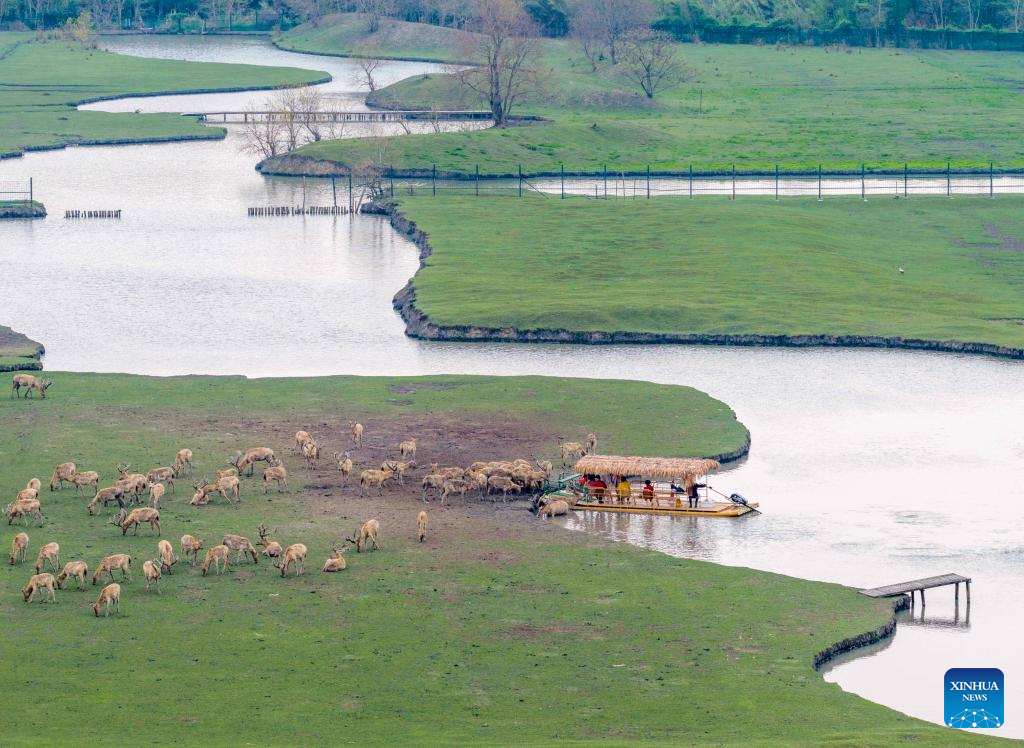 An aerial drone photo taken on April 17, 2026 shows tourists taking a raft interacting with elks at a national wetland park in Jiangyan District of Taizhou City, east China's Jiangsu Province. (Photo by Zhou Shegen/Xinhua)