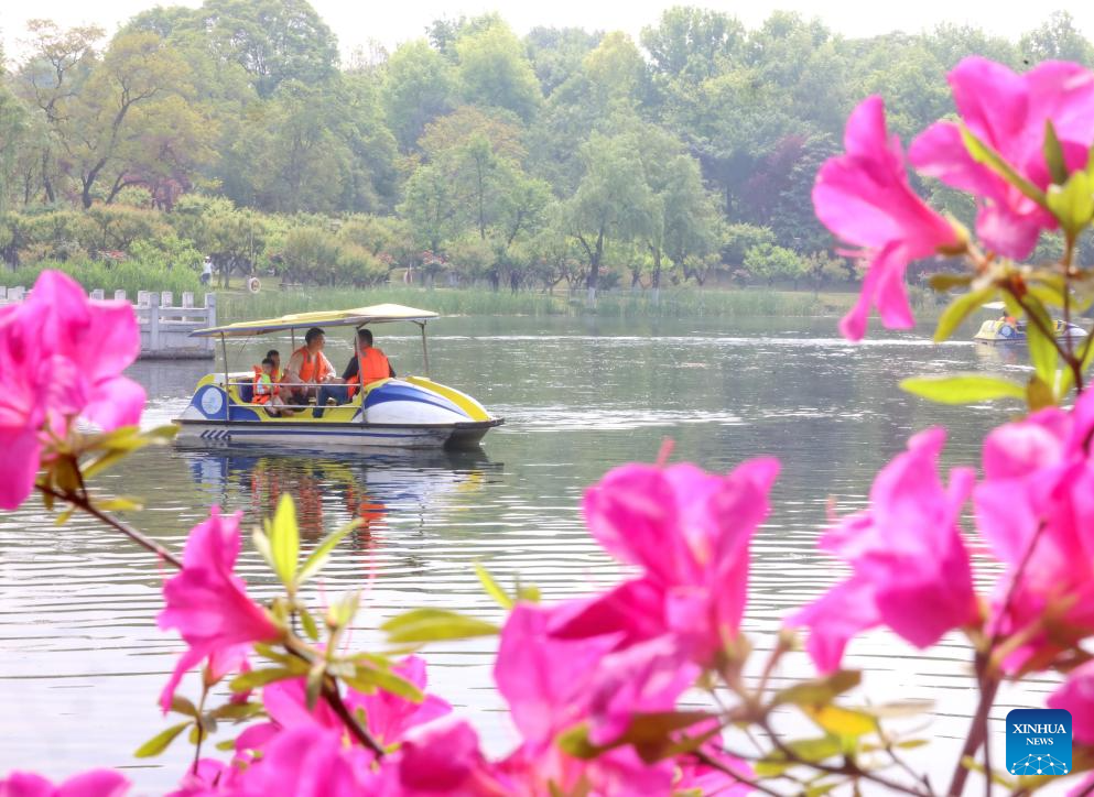 Tourists take a boat tour to enjoy the blossoms at the Qingshan Park in Wuhan, central China's Hubei Province, April 18, 2026. (Photo by Zhao Jun/Xinhua)