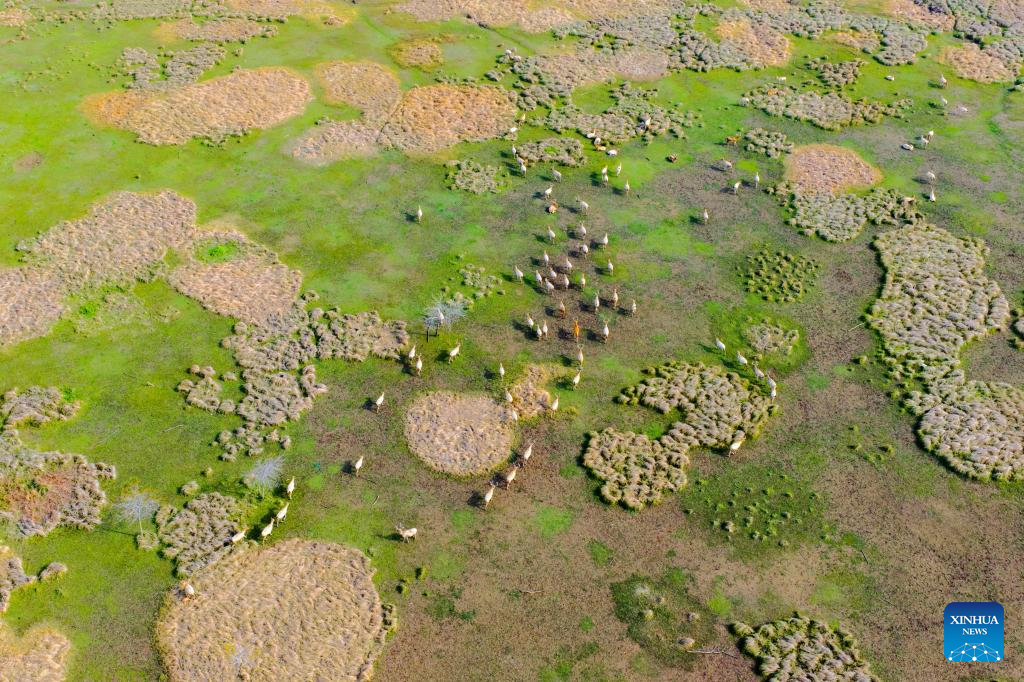 An aerial drone photo taken on April 15, 2026 shows elks foraging at Tiaozini wetland in Dongtai of Yancheng City, east China's Jiangsu Province. (Photo by Sun Jialu/Xinhua)