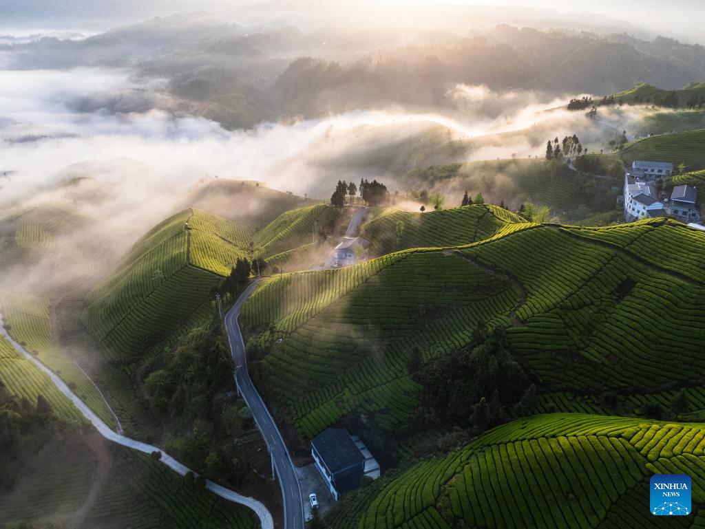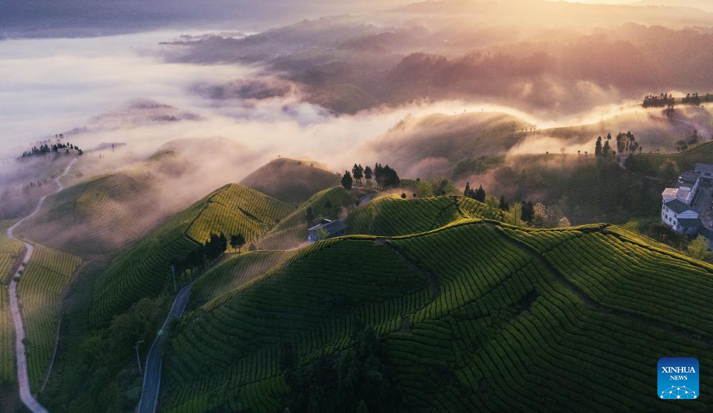 An aerial drone photo taken on April 18, 2026 shows a view of tea gardens on Mu'er Mountain of Hefeng County, central China's Hubei Province. (Photo by Qin Tao/Xinhua)