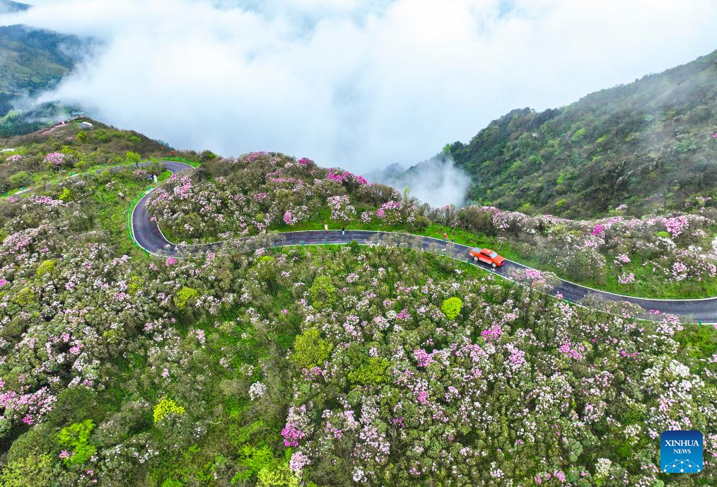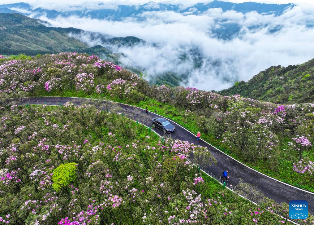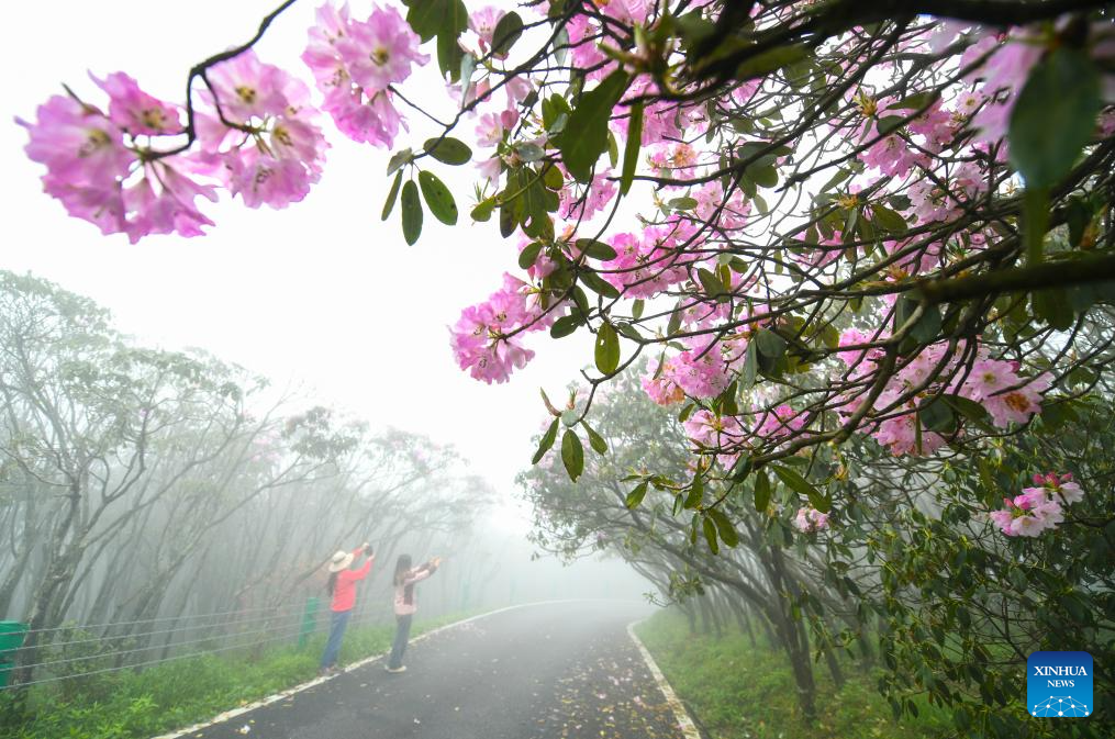 Tourists take photos of blooming rhododendrons at a national forest park in Shuangpai County, Yongzhou City of central China's Hunan Province, April 17, 2026. (Photo by Zhou Xiuyuchun/Xinhua)