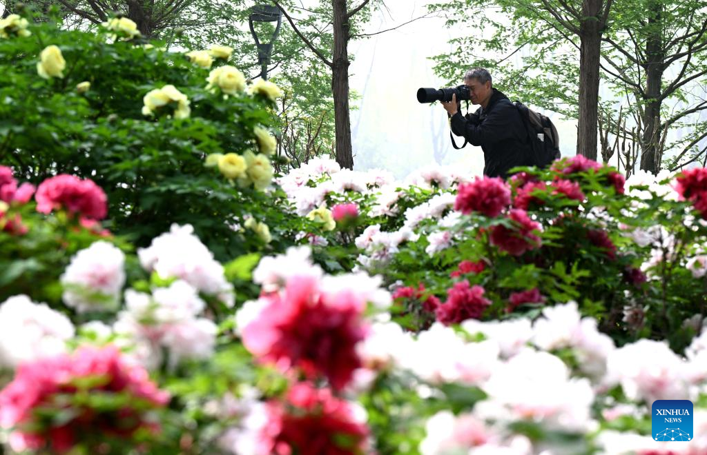 A photography enthusiast takes photos at the peony garden of the Shijiazhuang botanical garden in Shijiazhuang, north China's Hebei Province, April 18, 2026. (Photo by Chen Qibao/Xinhua)