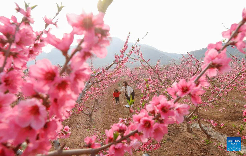Tourists enjoy blossoms at a peach orchard in Dangyu Town of Zunhua City, north China's Hebei Province, April 15, 2026. (Photo by Liu Mancang/Xinhua)