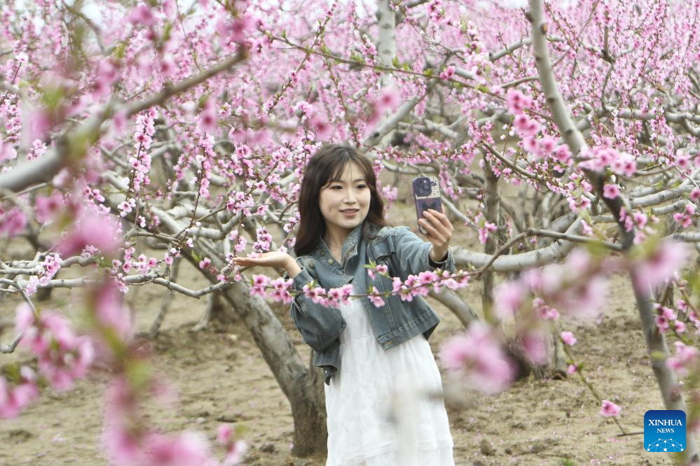 A tourist takes selfies at a peach orchard in Nanyuan Township, Linxia County of Linxia Hui Autonomous Prefecture, northwest China's Gansu Province, April 16, 2026. (Photo by Shi Youdong/Xinhua)