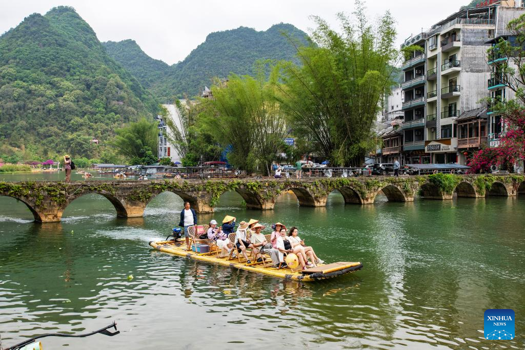 Tourists take a bamboo raft tour in the Equan scenic spot of Jingxi City, south China's Guangxi Zhuang Autonomous Region, April 17, 2026. (Photo by Zhao Jingwu/Xinhua)