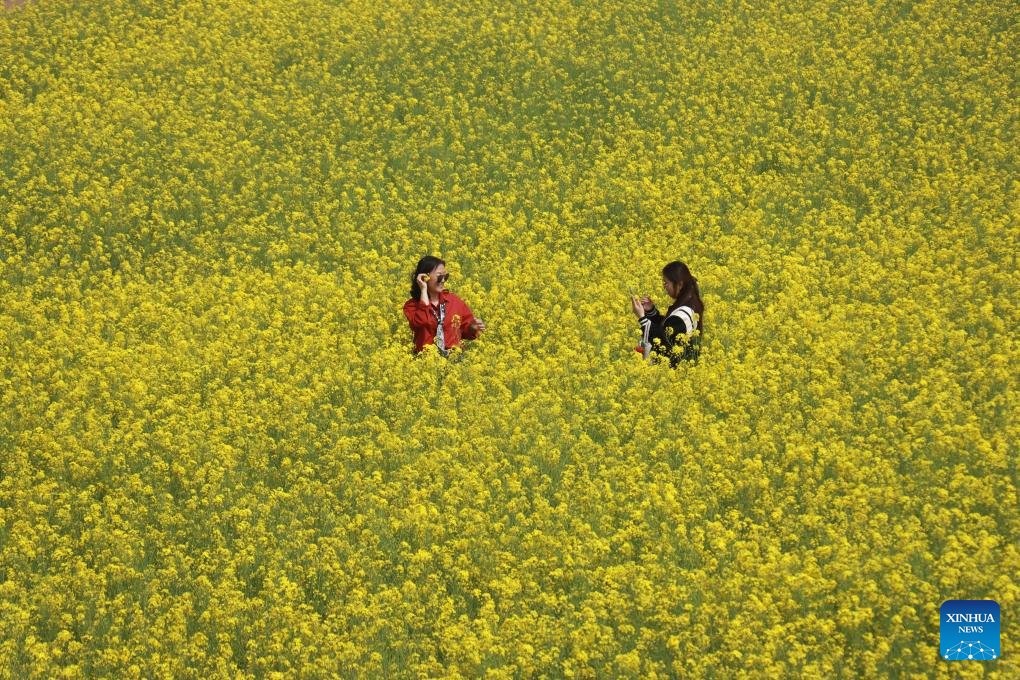 Tourists take photos at a rapeseed flower field in Bocheng Town of Neihuang County, Anyang City of central China's Henan Province, April 17, 2026. (Photo by Liu Xiaokun/Xinhua)