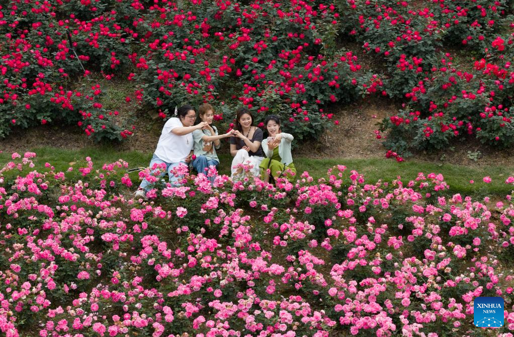 A drone photo taken on April 15, 2026 shows people taking selfies amid flowers in Cuiping District of Yibin City, southwest China's Sichuan Province. (Photo by Peng Minxiang/Xinhua)
