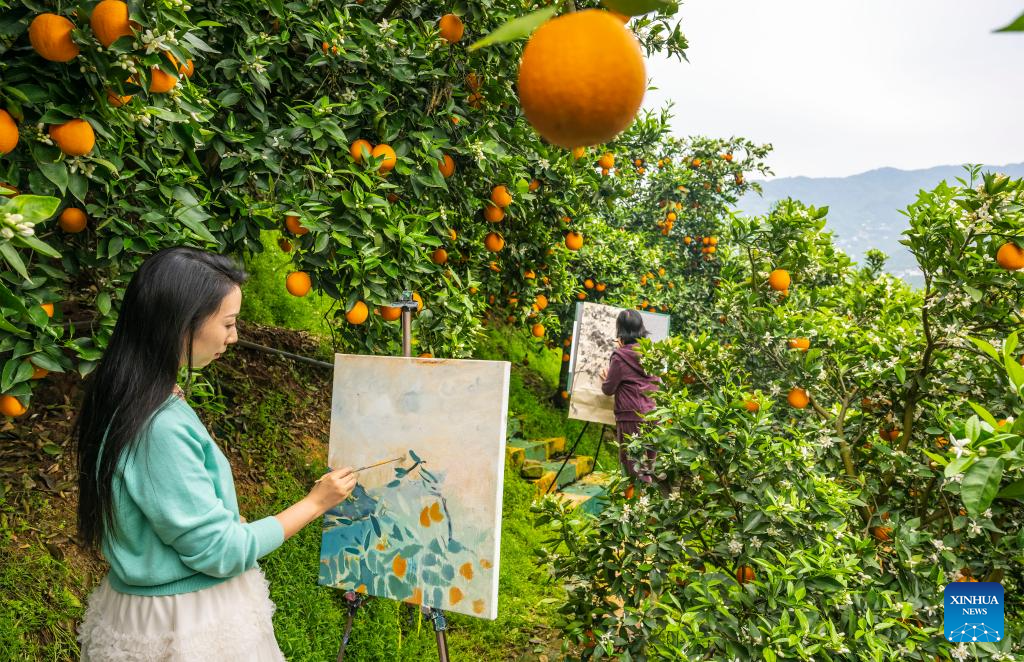 People paint at an orange orchard of Shuitianba Township, Zigui County of central China's Hubei Province, April 15, 2026. (Photo by Zheng Jiayu/Xinhua)