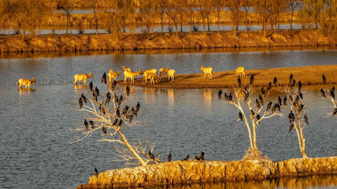 Migrant birds and milu deer are seen in Tiaozini wetland in Dongtai, Yancheng, east China's Jiangsu province. (Photo/Huang Jia)