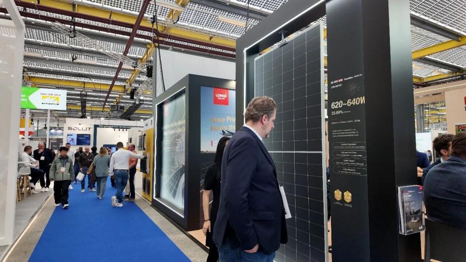 Photo shows the exhibition booth of LONGi at the Solar Solutions Amsterdam 2026 exhibition. (Photo provided by LONGi)