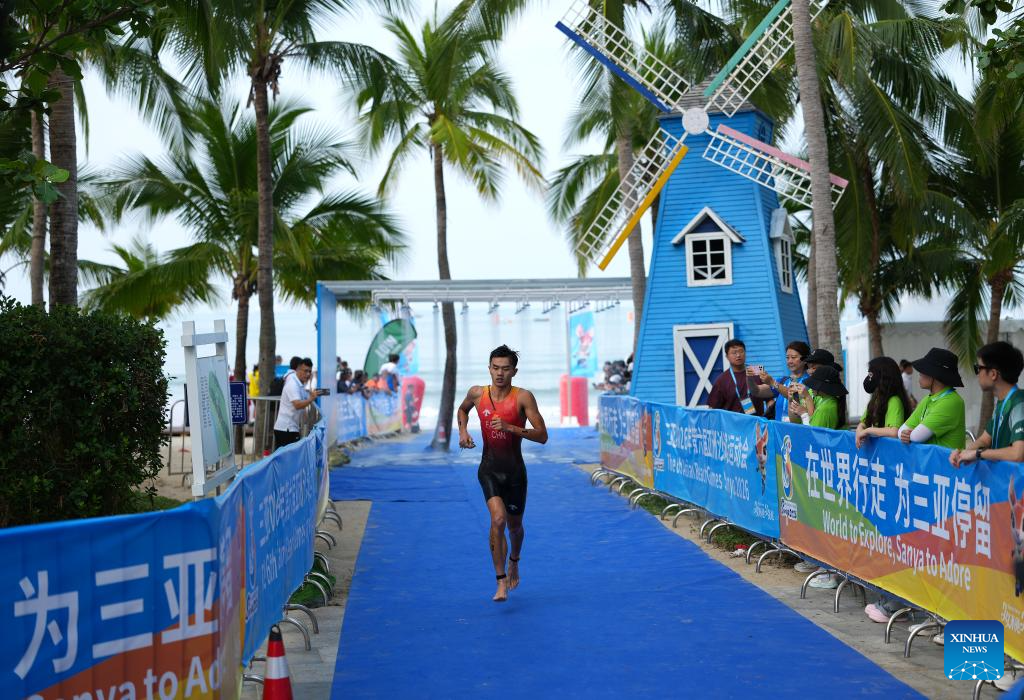 Fan Junjie of China competes during the men's individual of aquathlon event at the 6th Asian Beach Games in Sanya, south China's Hainan Province, April 23, 2026. (Xinhua/Pan Yulong)