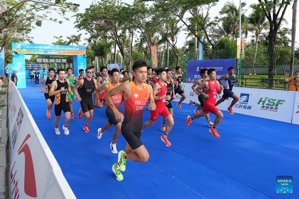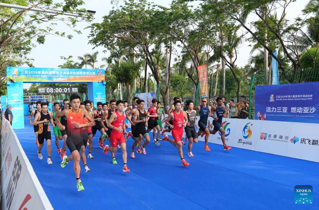 Athletes start during the men's individual of aquathlon event at the 6th Asian Beach Games in Sanya, south China's Hainan Province, April 23, 2026. (Xinhua/Pan Yulong)