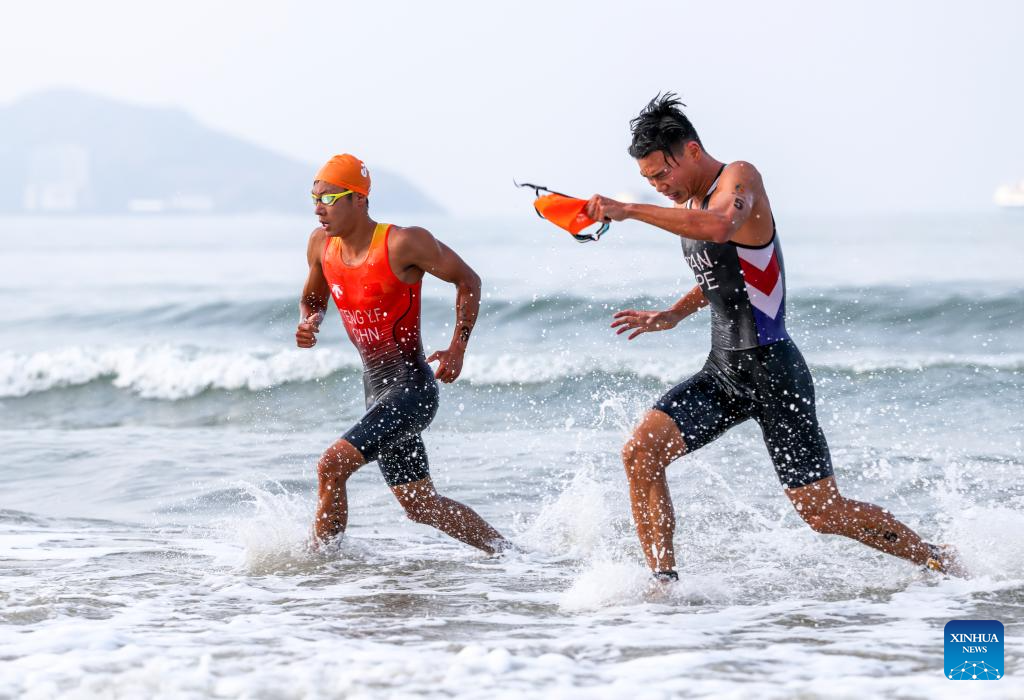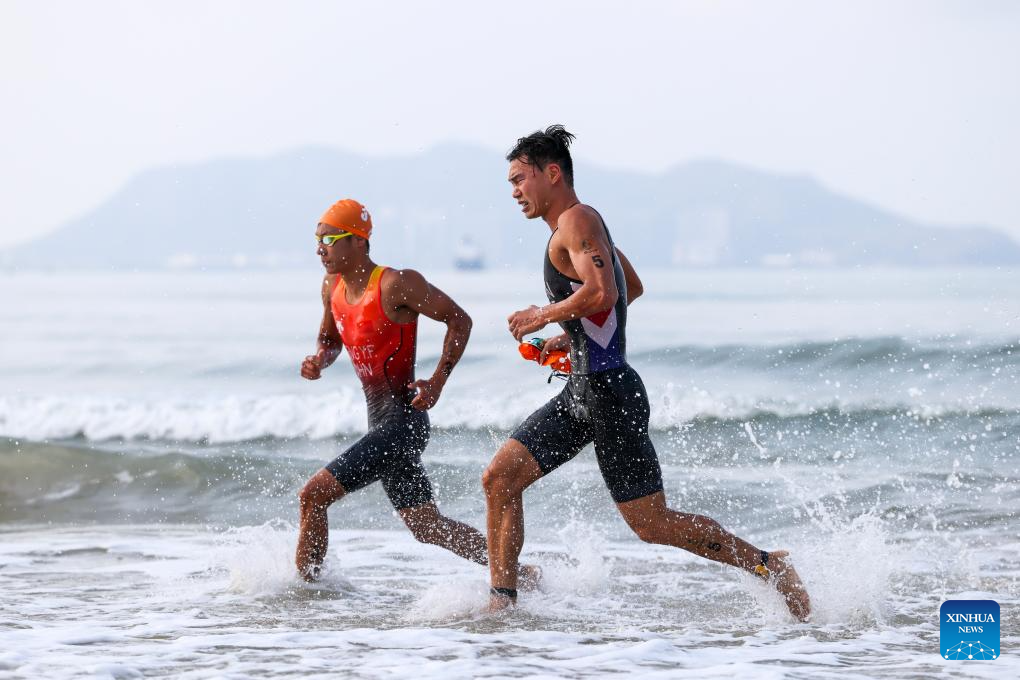 Teng Yunfeng (L) of China and Pan Tzu-I of Chinese Taipei compete during the men's individual of aquathlon event at the 6th Asian Beach Games in Sanya, south China's Hainan Province, April 23, 2026. (Xinhua/Zhu Zheng)