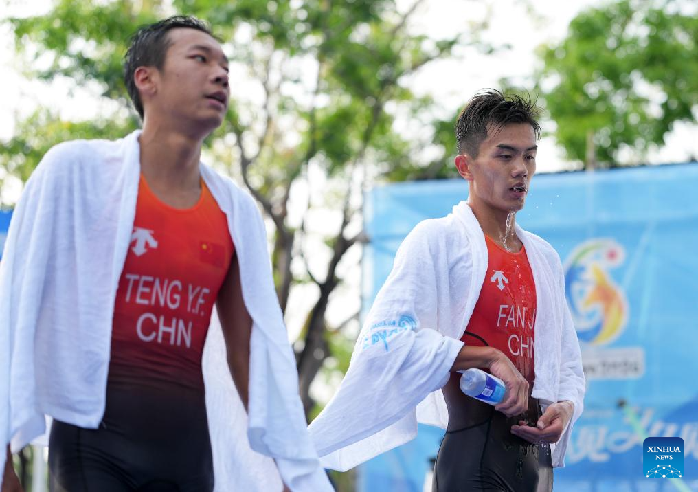 Fan Junjie (R) and Teng Yunfeng of China react after during the men's individual of aquathlon event at the 6th Asian Beach Games in Sanya, south China's Hainan Province, April 23, 2026. (Xinhua/Pan Yulong)