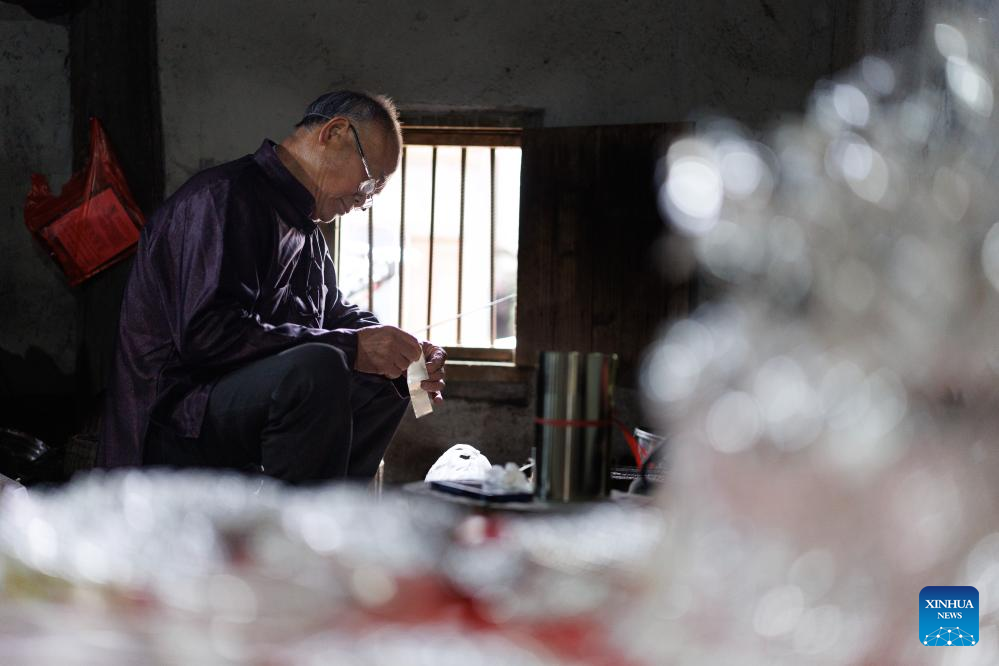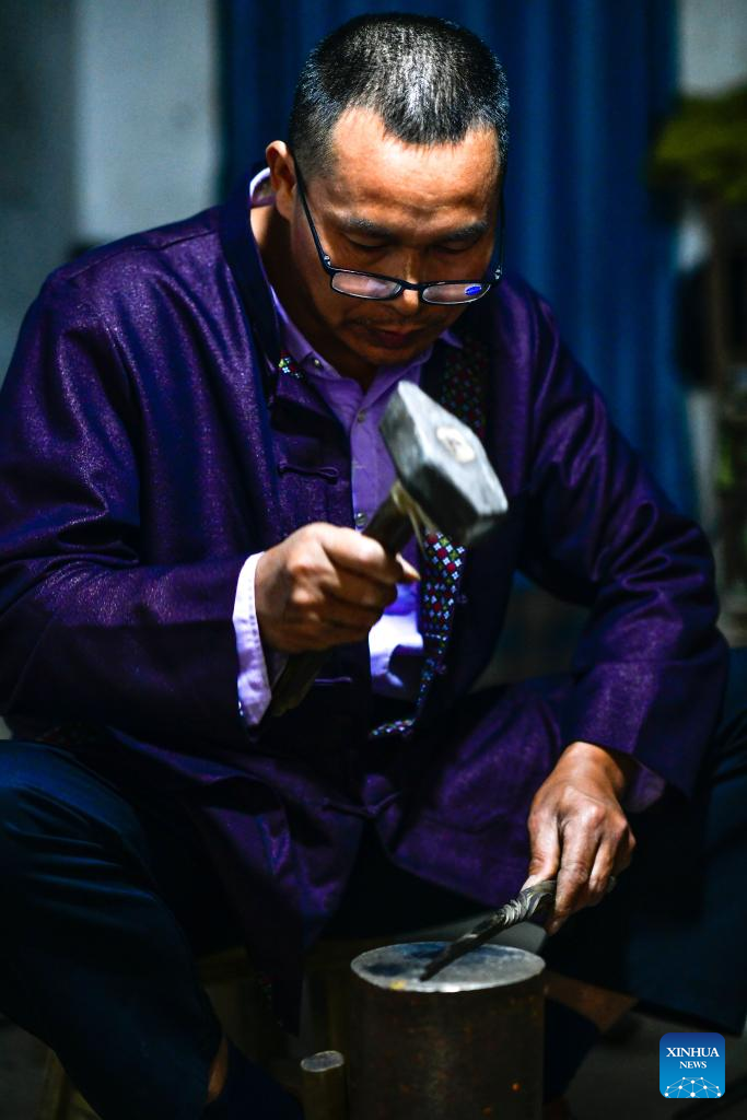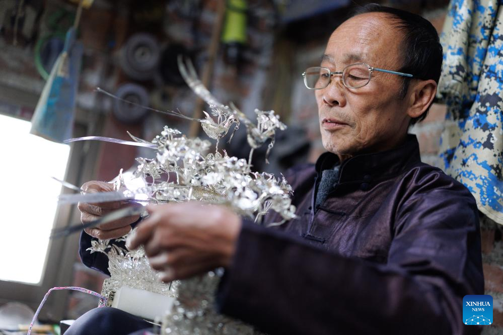 A silversmith works on a silver ornament in Shuikou Township of Liping County, southwest China's Guizhou Province, April 21, 2026.