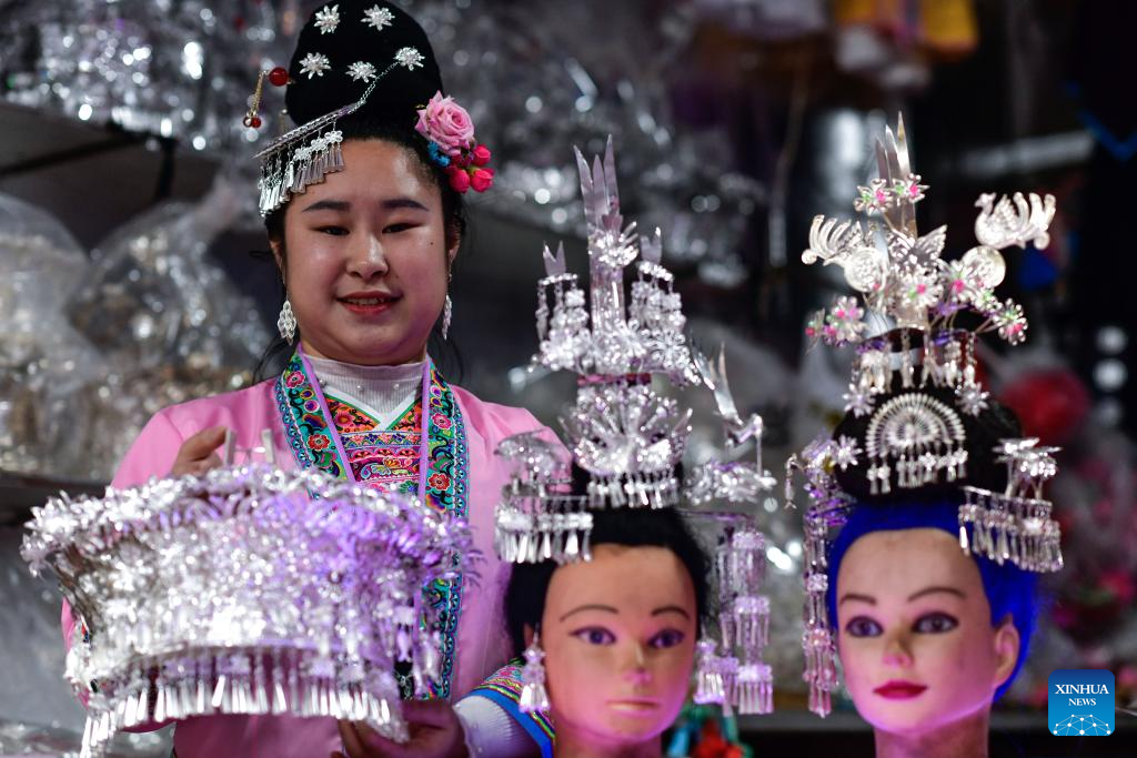 In the past, silver ornaments were worn only during festivals. Today silver forging workshops thrive here. Craftsmen innovate by developing cultural and creative products, expanding sales channels through e-commerce and cultural tourism markets. The silver ornament products of Liping now enjoy strong demand both domestically and internationally. (Xinhua/Liu Xu)