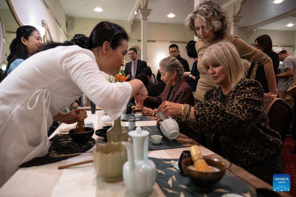 People experience traditional Chinese tea culture during the "Tea for Harmony" Yaji Cultural Salon in Auckland, New Zealand, April 22, 2026. The "Tea for Harmony" Yaji Cultural Salon was held on Wednesday evening in Auckland, New Zealand's largest city. Organized by the China Cultural Center in Auckland, the event, which also featured a concert by the Amber Quartet, integrated Chinese tea culture with Western classical music, as it opened with tea tasting, traditional tea preparation, tea appreciation and storytelling about tea culture, creating an elegant and harmonious atmosphere. (Photo by Wu Jiaxiang/Xinhua)