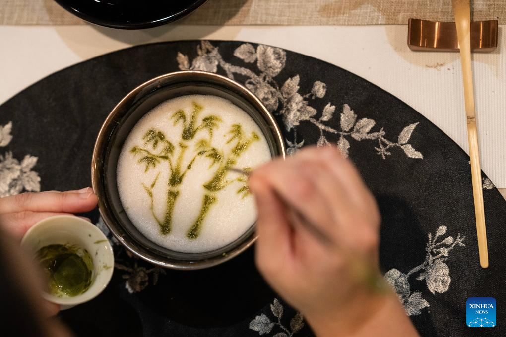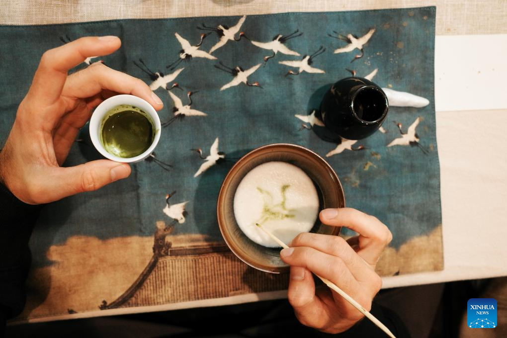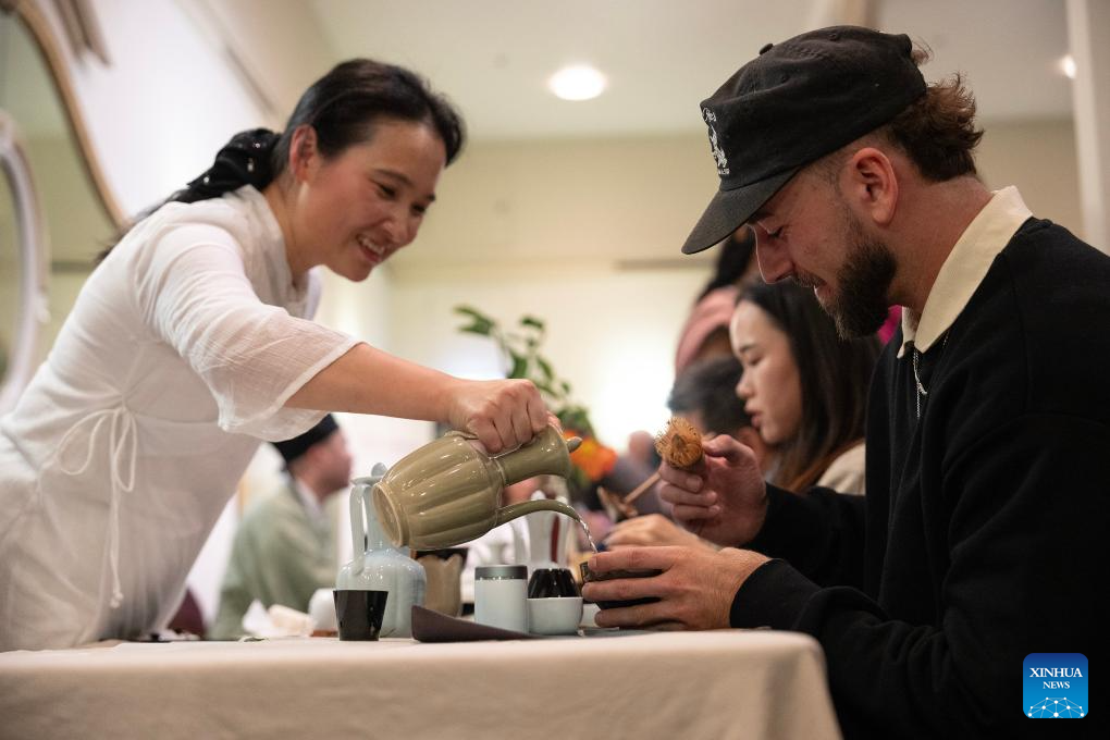 A participant experiences traditional Chinese tea culture during the "Tea for Harmony" Yaji Cultural Salon in Auckland, New Zealand, April 22, 2026. The "Tea for Harmony" Yaji Cultural Salon was held on Wednesday evening in Auckland, New Zealand's largest city. Organized by the China Cultural Center in Auckland, the event, which also featured a concert by the Amber Quartet, integrated Chinese tea culture with Western classical music, as it opened with tea tasting, traditional tea preparation, tea appreciation and storytelling about tea culture, creating an elegant and harmonious atmosphere. (Photo by Wu Jiaxiang/Xinhua)