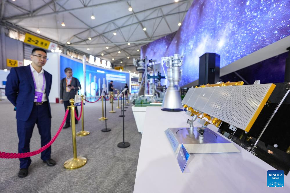 Guests view satellite exhibits at an aerospace science exhibition in Chengdu, southwest China's Sichuan Province, April 24, 2026. An event marking the 11th Space Day of China kicked off in Chengdu on Friday, under the theme "A Seven-Decade Celestial Path, A shared Cosmos Faith." A series of activities are scheduled during this year's event, including an opening ceremony, an aerospace science exhibition, an aerospace culture and arts forum.