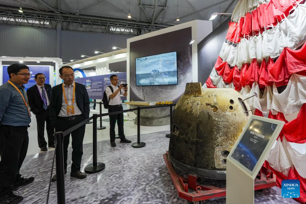 Guests view the Chang'e-6 return capsule displayed at an aerospace science exhibition in Chengdu, southwest China's Sichuan Province, April 24, 2026. An event marking the 11th Space Day of China kicked off in Chengdu on Friday, under the theme "A Seven-Decade Celestial Path, A shared Cosmos Faith." A series of activities are scheduled during this year's event, including an opening ceremony, an aerospace science exhibition, an aerospace culture and arts forum.