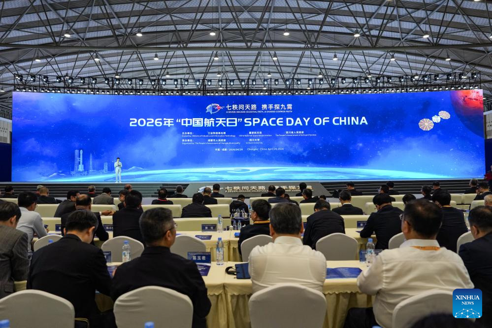 Guests attend the opening ceremony of the 11th Space Day of China in Chengdu, southwest China's Sichuan Province, April 24, 2026. An event marking the 11th Space Day of China kicked off in Chengdu on Friday, under the theme "A Seven-Decade Celestial Path, A shared Cosmos Faith." A series of activities are scheduled during this year's event, including an opening ceremony, an aerospace science exhibition, an aerospace culture and arts forum.