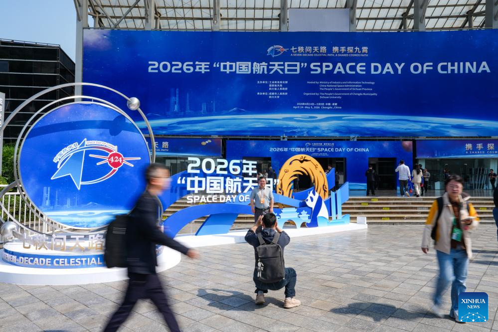 A man poses for photos outside the venue for an event marking the 11th Space Day of China in Chengdu, southwest China's Sichuan Province, April 24, 2026. An event marking the 11th Space Day of China kicked off in Chengdu on Friday, under the theme "A Seven-Decade Celestial Path, A shared Cosmos Faith." A series of activities are scheduled during this year's event, including an opening ceremony, an aerospace science exhibition, an aerospace culture and arts forum.