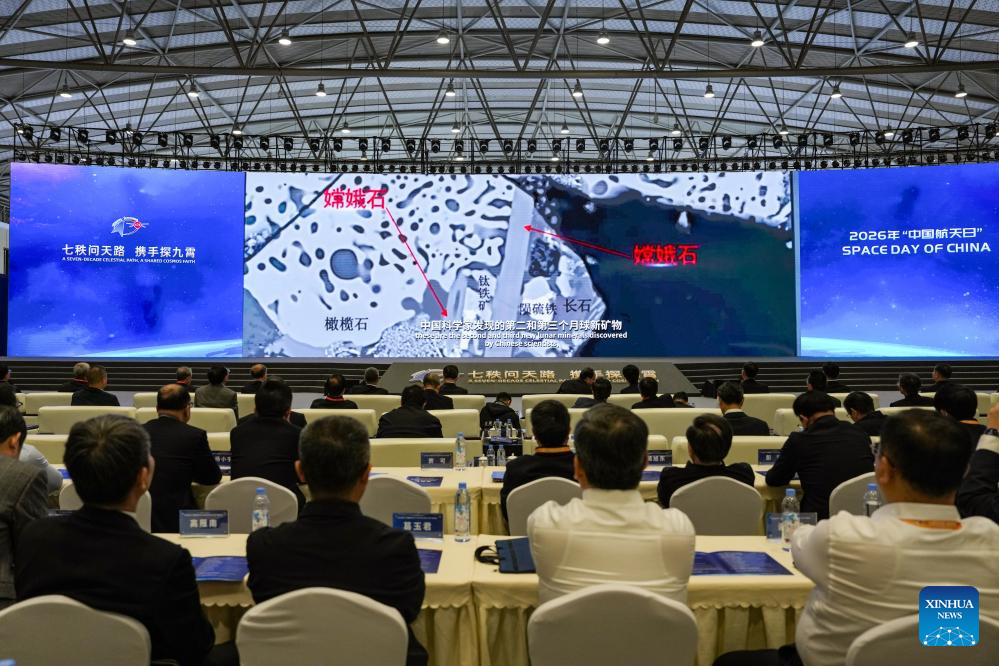 The latest scientific achievement in the lunar samples brought back by China's Chang'e-5 mission is announced during the opening ceremony of the 11th Space Day of China in Chengdu, southwest China's Sichuan Province, April 24, 2026. An event marking the 11th Space Day of China kicked off in Chengdu on Friday, under the theme "A Seven-Decade Celestial Path, A shared Cosmos Faith." A series of activities are scheduled during this year's event, including an opening ceremony, an aerospace science exhibition, an aerospace culture and arts forum.