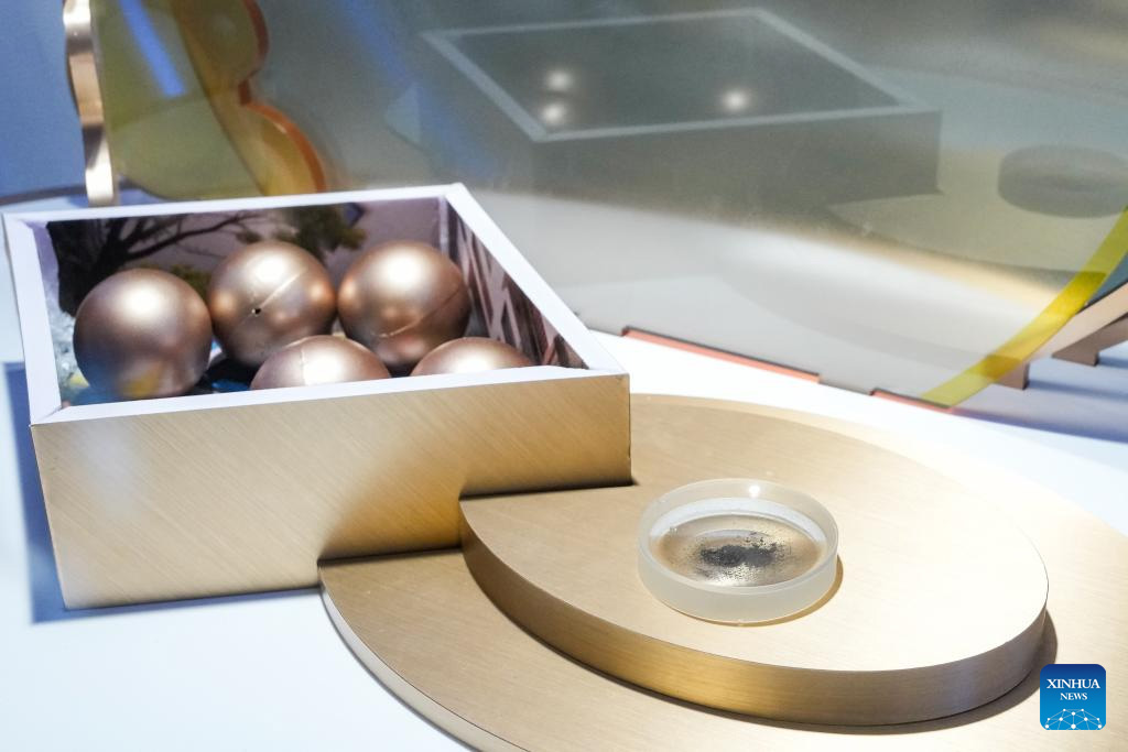 This photo taken on April 24, 2026 shows a lunar sample collected by China's Chang'e-5 mission, at an aerospace science exhibition in Chengdu, southwest China's Sichuan Province. An event marking the 11th Space Day of China kicked off in Chengdu on Friday, under the theme "A Seven-Decade Celestial Path, A shared Cosmos Faith." A series of activities are scheduled during this year's event, including an opening ceremony, an aerospace science exhibition, an aerospace culture and arts forum.