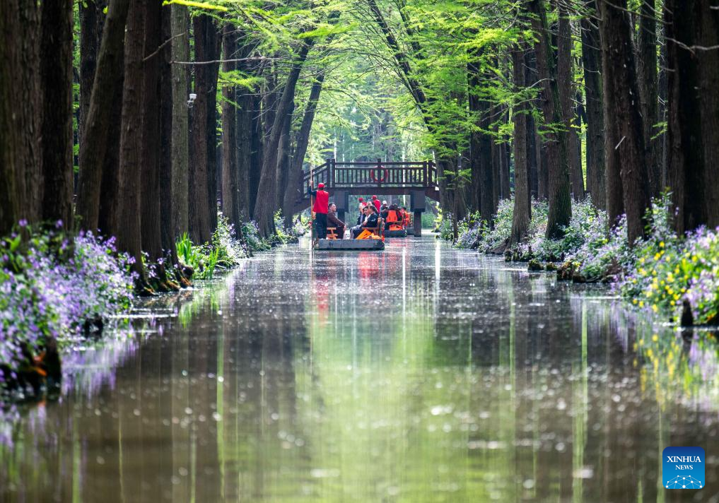 Tourists take the boat at a park in Xinghua City, east China's Jiangsu Province, April 23, 2026. (Photo by Yang Yugang/Xinhua)