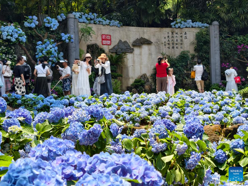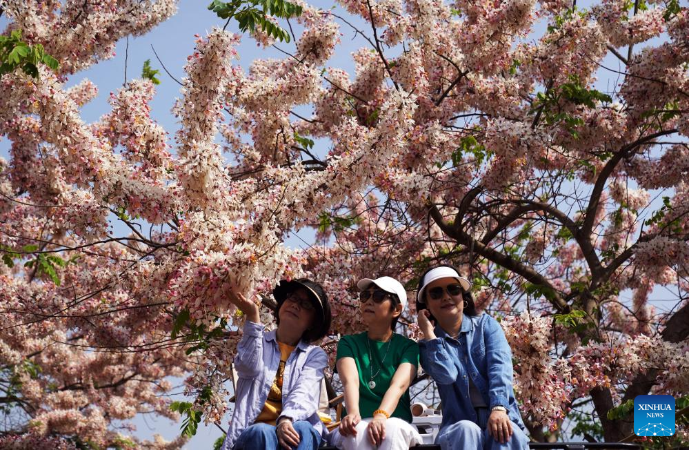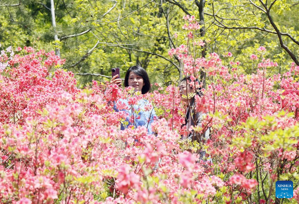 People take photos in front of flowers in Shijiazhuang, north China's Hebei Province, April 24, 2026. (Photo by Liang Zidong/Xinhua)