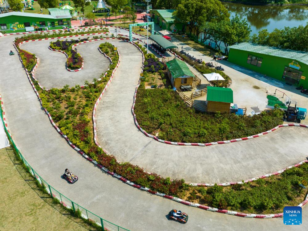 An aerial drone photo taken on April 26, 2026 shows tourists driving go-karts in Xiaogucheng Village of Jingshan Town in Yuhang District of Hangzhou City, east China's Zhejiang Province. Currently, Hangzhou has developed a series of rural cultural tourism projects, attracting tourists for sightseeing and consumption, and infusing new vitality into the local "spring economy." (Xinhua/Jiang Han)