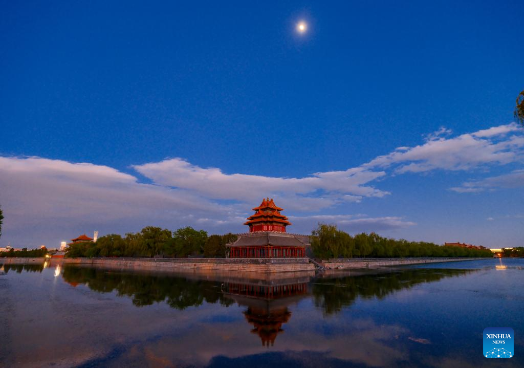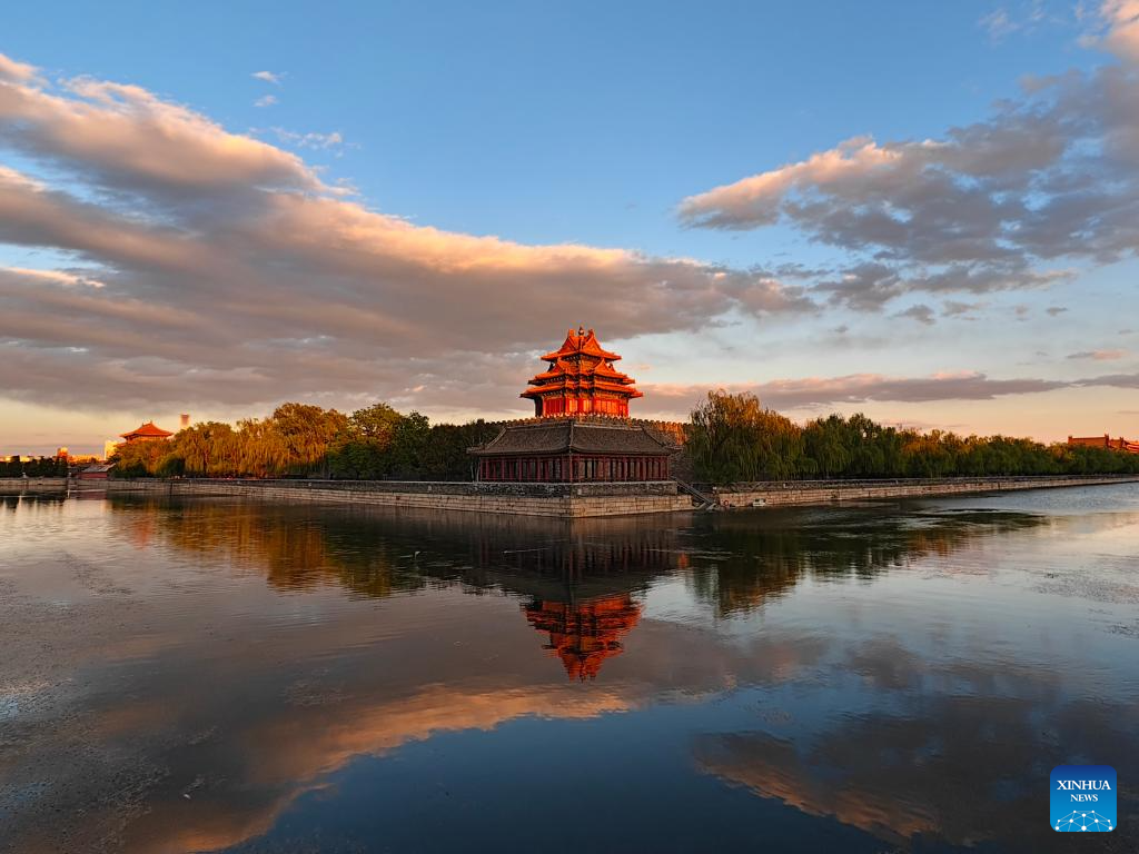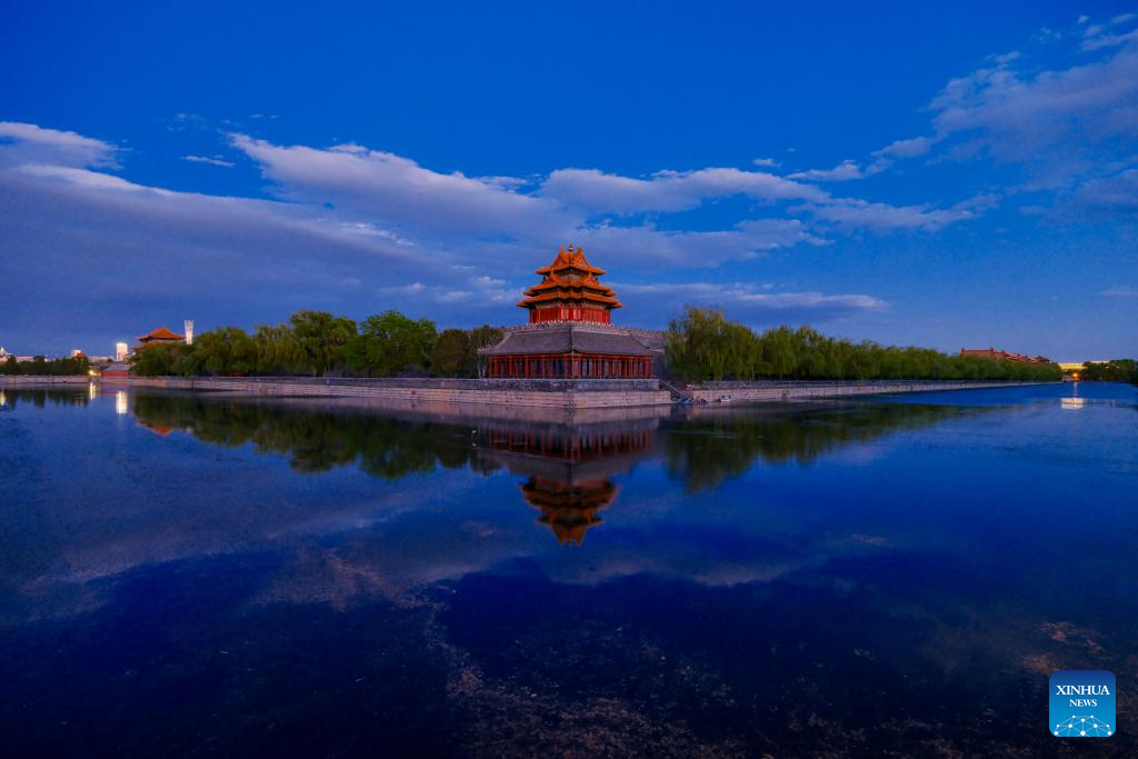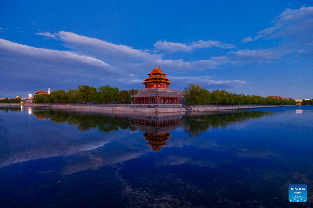 This photo taken on April 27, 2026 shows the view of a turret of the Palace Museum at twilight in Beijing, capital of China. (Xinhua/Chen Yehua)