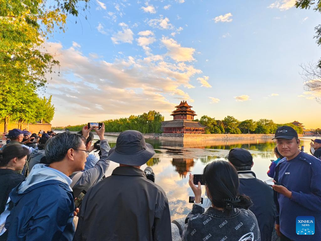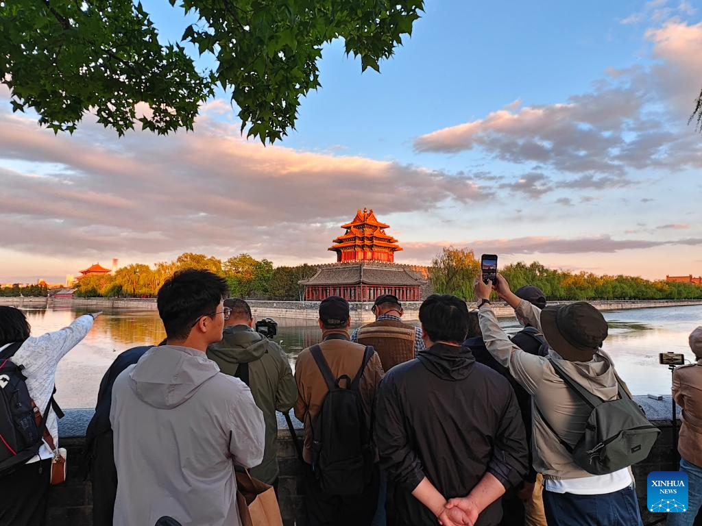 This photo taken with a mobile phone on April 27, 2026 shows tourists enjoying the view of a turret of the Palace Museum in Beijing, capital of China. (Xinhua/Xu Jinquan)